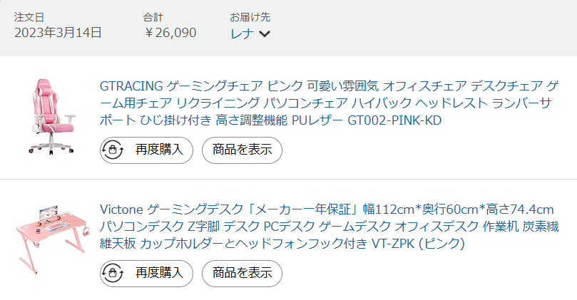 ほしい物リストからだと思うんだけどゲーミングデスクとチェアが届きまちた………あ、ありがとうございま…す
